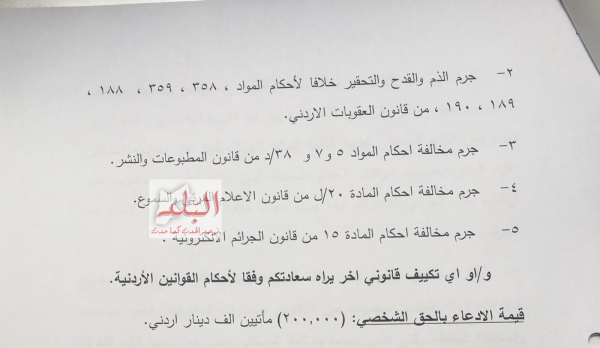 وطالبت لائحة الشكوى بقيمة الادعاء بالحق الشخصي 200 ألف دينار.