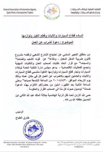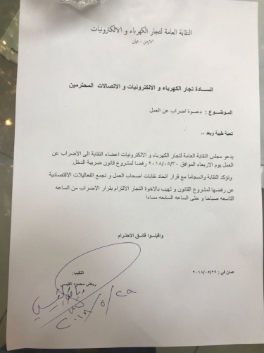 لا يوجد قطاع تجاري او صناعي ..نقابي او جمعيات الا واعلنت موقفها بشكل واضح ورسمي تضد مشروع قانون الضريبة الجديد وتضامنهم مع الاضراب الشامل الذي سينفذ يوم غد الاربعاء احتجاجا على المشروع ..