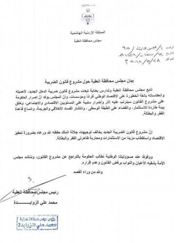 واكدت بعض مجالس المحافظات كمحافظة العقبة رفضها ايضا لمشروع قانون الضريبة الجديد ..حيث انه يخالف توجيهات جلالة الملك بضرورة تحفيز الاقتصاد واستقطاب مزيدا من الاستثمارات ومحاربة ظاهرتي الفقر والبطالة .. منوة على ان المشروع سيترتب عليه آثار واضرار سلبية على المستويين الاقتصادي والاجتماعي وخلق بيئة طاردة للاستثمار والقضاء على الطبقة الوسطى واتساع دائرة الفقر والبطالة ..