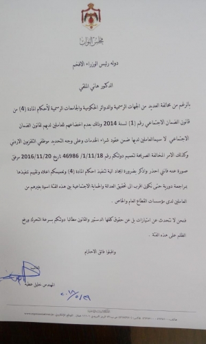 بين النائب خليل عطية في كتاب وجهه لرئيس الوزراء هاني الملقي بوجود العديد من الجهات الرسمية والدوائر الحكومية والجامعات الرسمية مخالفة لأحكام المادة 4 من قانون الضمان الاجتماعي،وعلى وجه التحديد الموظفين في التلفزيون الأردني.