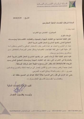 دعا نقيب شركات الخدمات المالية وليد النجار شركات الوساطة المالية التعبير عن رفضهم لمشروع قانون ضريبة الدخل الجديد عن طريق المشاركة في الإضراب الذي دعت إليه النقابات المهنية ومؤسسات المجتمع المدني يوم غد الأربعاء.