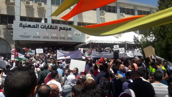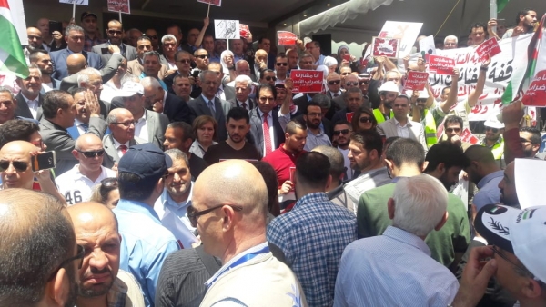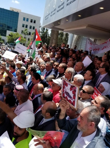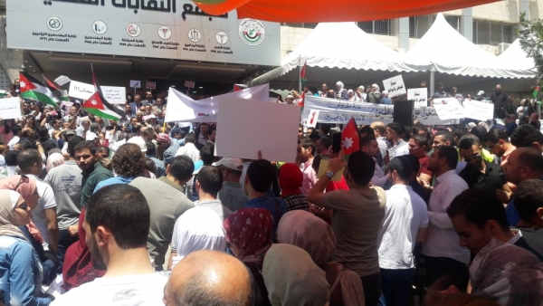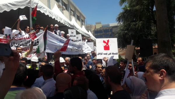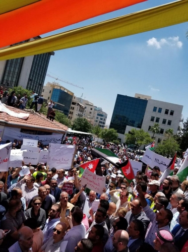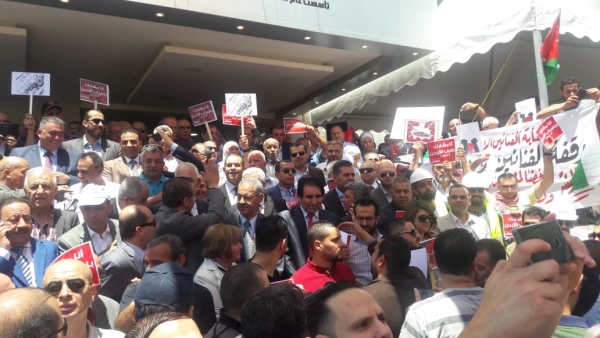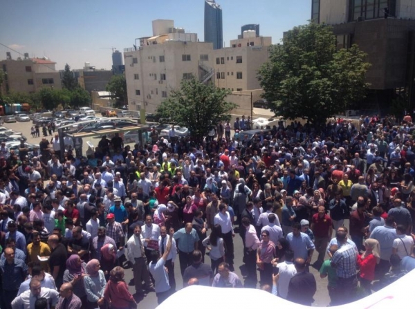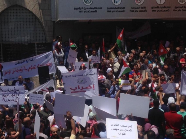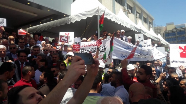 وهتف العديد من الاردنيين مطالبين باسقاط قانون الضريبة الجديد من امام مجمع القنبات المهنية مؤكدين بأن التراجع عن القانون الحل الوحيد لحفظ سلامة وامن المواطن الاردني