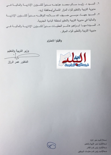 قرر وزير التربية والتعليم اجراء تشكيلات وتنقلات بين مدراء الادارة :