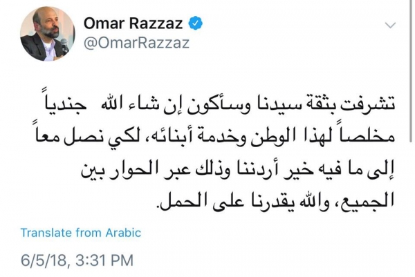 وقال الرزاز عبر تويتر تشرفت بثقة سيدنا وسأكون إن شاء الله جندياً مخلصاً لهذا الوطن وخدمة أبنائه، لكي نصل معاً إلى ما فيه خير أردننا وذلك عبر الحوار بين الجميع، والله يقدرنا على الحمل.