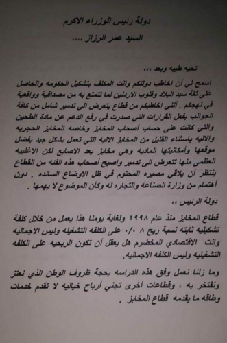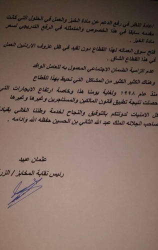 وجه رئيس نقابة المخابز في محافظة الزرقاء عثمان عبيد رسالة الى رئيس الوزراء المكلف عمر الرزاز طالبه خلالها باعطاء القطاع اولوية في اجندة عمل حكومته المقبلة.