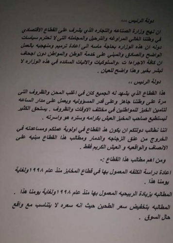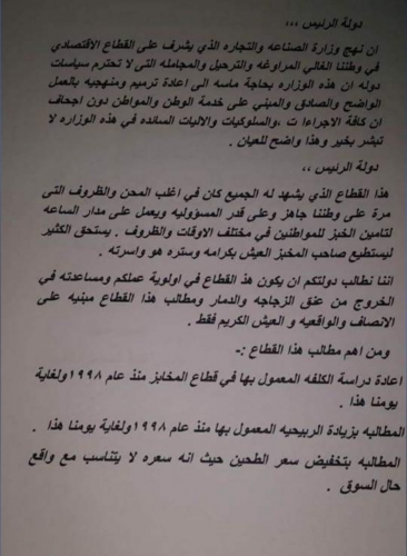 هذا الى جانب عدد من المطالب وتوضح ما وصل اليه حال المخابز واصحابها بعد فرض الضرائب الذي اقرته الحكومة السابقة ولم تستمع الى مطالبهم.