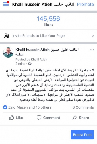 وأضاف عطية على صفحته في موقع التواصل الاجتماعي (الفيس بوك) ان الشقيقة قطر كان لها مواقف مشرفة لا حجة ولا عذر بعد الآن لبقاء سفير دولة قطر الشقيقة بعيدا عن اهله وذويه النشامى الاردنيين،