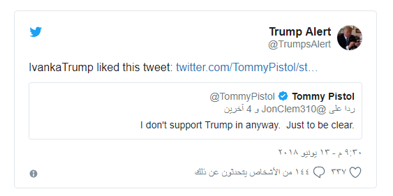 ووفقا لما نشره موقع "مشابل"، فإن حساب إيفانكا الرسمي على "تويتر" وضع إعجابا لتغريدة كتب فيها الممثل الإباحي المشهور تومي بيستول: "حتى أكون واضحا، فأنا لا أدعم ترامب بأي طريقة".