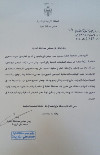 طالب مجلس محافظة العقبة ايقاف التعيينات وإعادة اجراءات طرح الإعلان التوظيف بشركة العقبة اللوجستية للمشتقات النفطية بشكل واضح وشفاف ومعلن للجميع وبالطرق الرسمية المتعبة في إعلانات التوظيف.