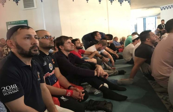 أخبار البلد - رغم روحانية المكان والمناسبة، يخيل إليك لوهلة أنك في ملعب لوجنيكي أو سبارتاك الشهيرين بموسكو واللذان يحتضنان أبرز مباريات كأس العالم بروسيا 2018. فصفوف المصلين في صلاة الجمعة بمسجد موسكو الكبير برزت فيها ألوان وشعارات الفرق المشاركة بالمونديال. فميسي نجم الأرجنتين الشهير يصلي في الصفوف الأمامية بارتداء أحد المصلين القميص الذي يحمل رقمه وكذلك صلى خلفه بعدة صفوف نيمار لاعب البرازيل الأغلى. محمد صلاح أو "مو صلاح” حضر متأخرًا إلى الصلاة فقام بقضاء ما فاته من ركعات وهو طبعًا طفل مصري بالحادية عشر من عمره حضر مع والده إلى المسجد وهو يرتدي قميص اللاعب الأبرز في فريق الفراعنة.