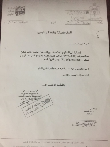 ومع ذلك فلا أي اهتمام بهذا الجانب ( البيئي والصحي ) . من قبل أمانه عمان التي جرى مراجعتها وتقدمنا لها بالعديد من الشكاوي وتم الكشف ولكن على المكرهة الصحية . وكان الجواب ( بعدم الاختصاص والصلاحيات ومع إصرارنا عليهم خاطبة الأمانة ( شركه مياهنا ) .التي بعد جهد قامت بالكشف والتأكد من وجود تسريب كبير للمياه العادمة وكان جوابها ( عدم الاختصاص ) لكوّن المشروع ما زال قيد التنفيذ ولَم تقم الشركة باستلامه . كما راجع السكان ( المركز الأمني في المنطقة ) والاتصال ب( بإدارة حماية البيئة الشرطية ) وإجاباتهم كانت (عدم الاختصاص ) .