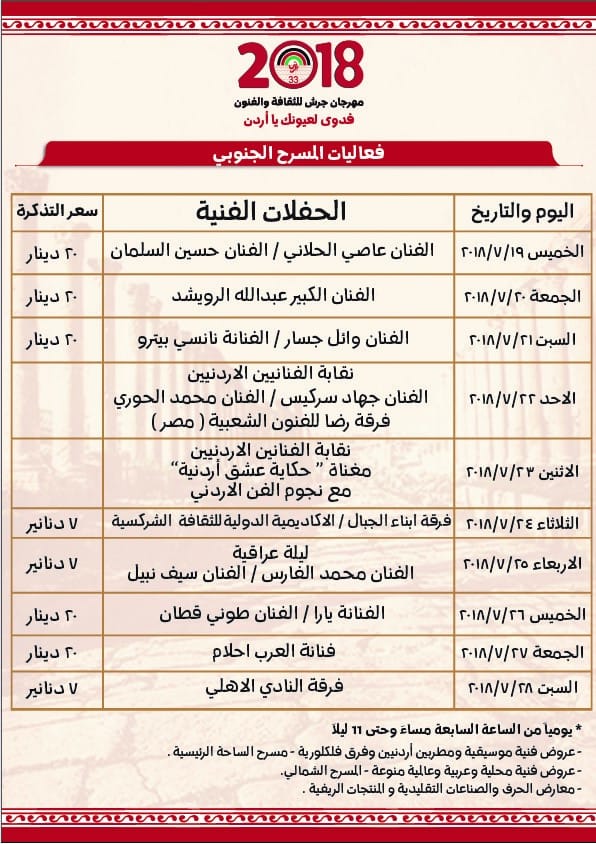 تعلن إدارة مهرجان جرش للثقافة والفنون عن توفر حفلات المسرح الجنوبي في المراكز التالية