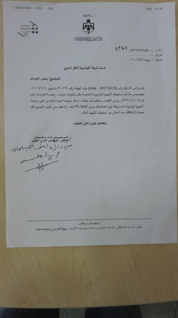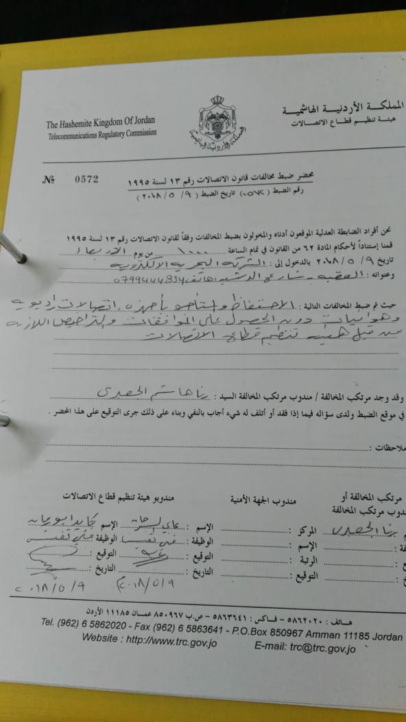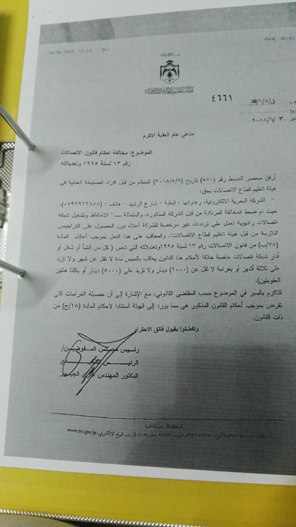 طلبت هيئة تنظيم قطاع الإتصالات من احد الشركات والتي قامت بمصادرة أجهزتها "الرادوية" – في وقت سابق – وعن طريق الشركة المستوردة وذلك لتسليمهم الاجهزة "الراديوية" "لا سلكي" وذلك بعد ضبطهم وتحرير مخالفة وذلك بسبب وجود ترددات الشركة الأم المصنعة لهذه الاجهزة في بلد المنشأ (الصين) في وقت سابق .