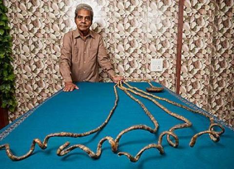 62 عاما مرت والقصافة لم تلمس أظافر يد "شيندهار شيلال” اليسرى،فالعجوز الهندي فاز للمرة الثانية على التوالى بلقب أطول أظافر في العالم بسبب عدم قصه لها منذ عام 1952، بعد دخوله في موسوعة "جينيس” في نوفمبر 2014.