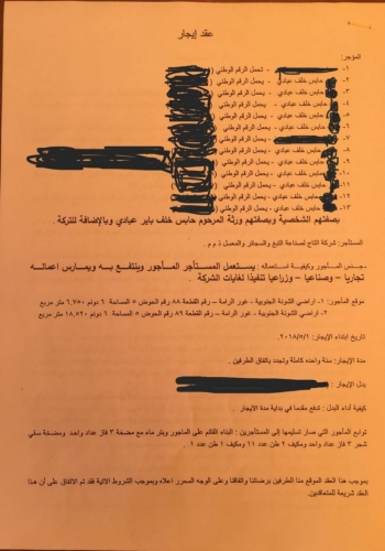كما يظهر عقد ايجار بين الشركة وأصحاب قطعة الأرض في الشونة الجنوبية بمنقطة الرامة، والمبرم لمدة سنة واحدة، لاستعمال قطعتي أرض للغايات التجارية والصناعية والزراعية.