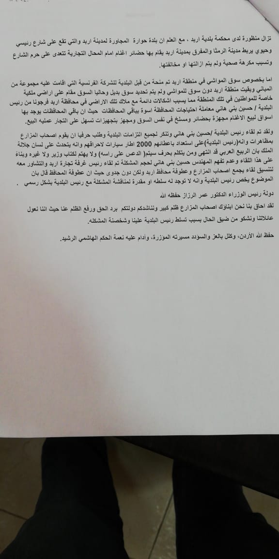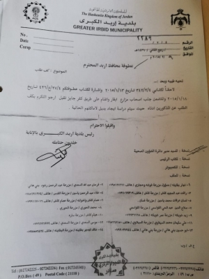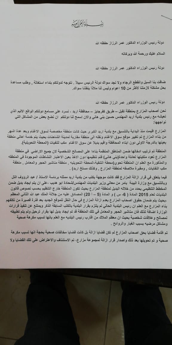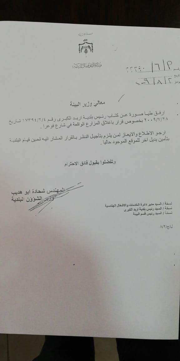 وأشار أن قرار الإزالة جاء موجها بكتب رسمية من بلدية اربد ممثلة برئاسة عبدالرؤوف التل وبالتنسيق مع وزارة البيئة بأمر من وزير البلديات الأسبق شحادة أبو هديب على أن يتم ايجاد البديل ضمن المخطط التنظيمي ويحدد من خلاله البديل لمنطقة المزارع بحيث تكون المنطقة خارج التنظيم بحسب نصوص قانون البلديات لعام 2015 المادة (6-س) والمادةة (5-20).