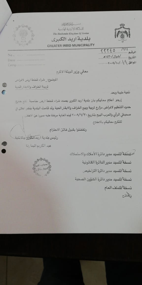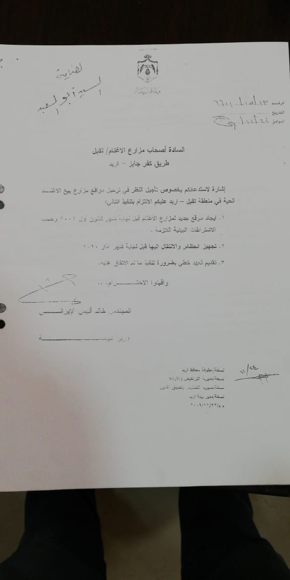 وبين ان قرار الترحيل لم يصير الى القرار القطعي حيث أن اغلب القضايا لا تزال منظورة والقضايا ليست بسبب شكاوى من سكان المنطقة بل مخالفات أصدرت بشكل عشوائي من بلدية اربد لايجاد ذريعة لترحيل المزارع مع العلم بأن الوضع البيئي السيء ليس من المزارع بل من محطة التنقية ومكب النفايات ومناشير الحجر.