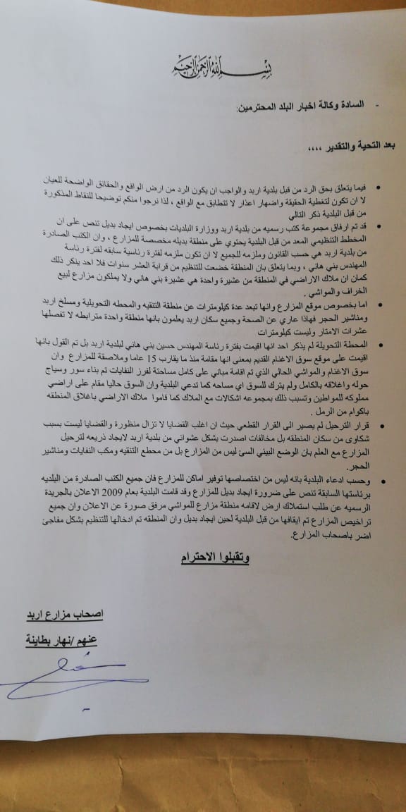 البطاينة أوضح في كتاب آخر وجهه لـ "أخبار البلد" وذلك ردا على ما أصدرته بدلية اربد الكبرى، أنه تم ارفاق مجموعة كتب رسمية من بلدية اربد ووزارة البلديات بخصوص ايجاد بديل تنص على أن المخطط التنظيمي المعد من قبل البلدية يحتوي على منطقة بديلة مخصصة للمزارع وأن الكتب الصادرة من البلدية هي حسب القانون وملزمة للجميع لا أن تكون ملزمة لفترة رئاسية سابقة لفترة رئاسة المهندس بني هاني وبما يتعلق بأن المنطقة خضعت للتنظيم من قرابة العشر سنوات.