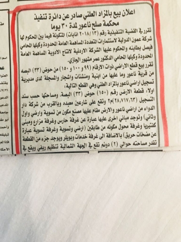 قررت محكمة تنفيذ صلح ناعور ببيع قطع الأراضي ذوات الأرقام (99 و 100 و 150) من حوض (33) البصه من قرية ناعور وما عليها من ابنية ومنشئات وأشجار والمسجة باسم الشركة الأردنية لإنتاج الأدوية بالمزاد العلني.