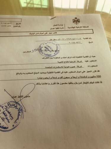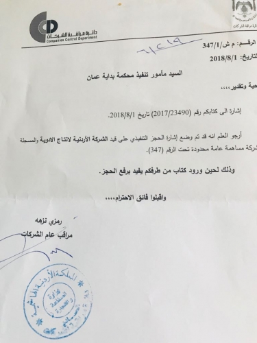 وقررت محكمة التمييز في وقت سابق إلزام الشركة الأردنية لإنتاج الأدوية دفع مبلغ وقيمته ثلاثة ملايين وثمانمئة ألف 3.8 لشركة عمون الدولية للاستثمارات المتعددة، والمباشرة بإجراءات التنفيذ والتحصيل تحت إشراف الدائرة القانونية،والحجز على أسهم وممتلكات الشركة.
