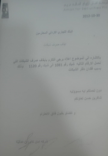 حدث غريب حصل يوم أمس الموافق 4/8/2018 من قبل شركة الكهرباء حيث فاجأت الشركة اعضاء مجلس إدارة شركة امان للارواق المالية "مساهمة عامة محدودة" بطلب مراجعتهم لشركة الكهرباء بخصوص وجود شيكات مقدمة من الشركة لهم ، حيث صدم اعضاء مجلس إدارة امان بهذا الطلب الغريب حيث لم تقم الشركة سابقا بتقديم اي شيكات لشركة الكهرباء ، فالشركة ليس لديها حساب وحسابها مغلق من عام 2012 حيث تعرضت بذات العام الى سرقة خزنتها بكاملها ومن ضمن المسروقات كانت شيكات.