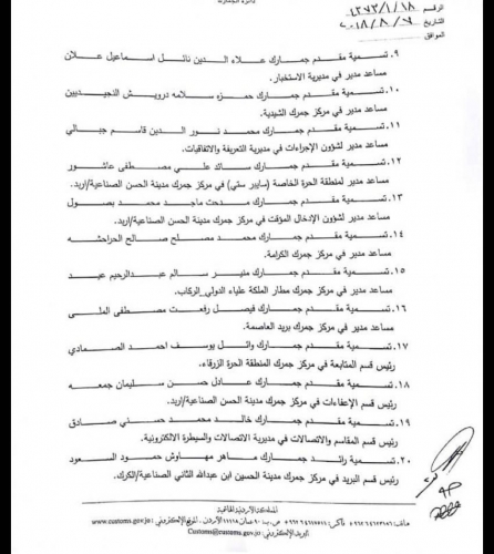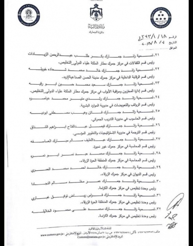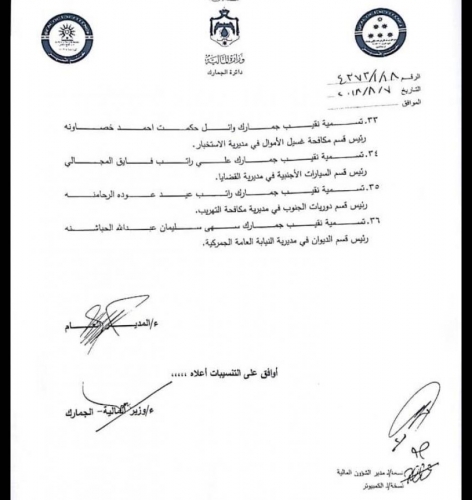 أخبار البلد - اخبار البلد - نسب مدير الجمارك وضاح الحمود إلى وزير المالية بتسمية ضباط جمارك في عدد من المراكز الجمركية، وذلك لاعتبارات ادارية وتنظيمية تقتضيها مصلحة العمل والمصلحة العامة، وفق الكتاب.