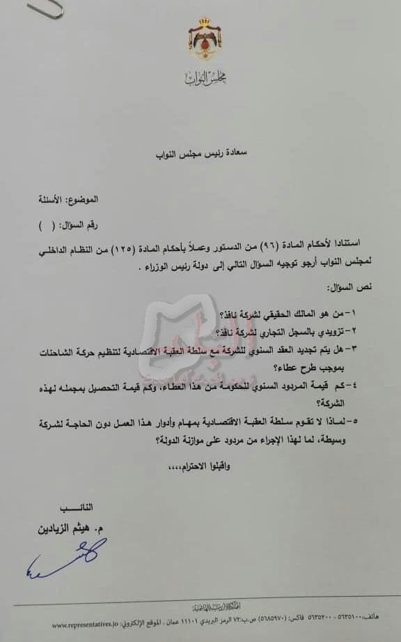 وطالب النائب زيادين من خلال سؤاله النيابي بتزويده بالسجل التجاري لشركة نافذ.