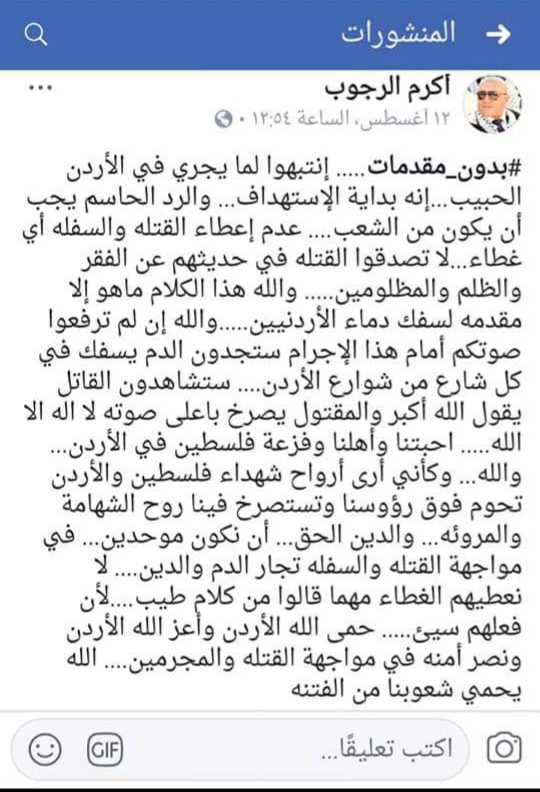 لم ينسَ رجل نابلس الأول ومحافظها ابن فلسطين اكرم الرجوب الوطن الاردني الذي طالما رأى فيه الظل التوأم لفلسطين الأم، وقد تداول نشطاء مواقع التواصل الاجتماعي عبر "الفيس بوك" منشورا له كتبه اثناء العمل الارهابي الشنيع الذي نفذته يد الجبناء في حادثة الفحيص قبل نحو اسبوعين.