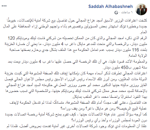 وقال الحباشنة بمنشور له عبر صفحته على الفيس بوك ان اعترافات الوزير الأسبق أمجد هزاع المجالي حول تفاصيل بيع شركة أمنية للإتصالات، كشفت خيوطًا جديدة وخطيرة تؤكد استهتار بعض المسؤولين وتقصيرهم بأداء واجبهم الوطني إزاء المحافظة على المال العام.
