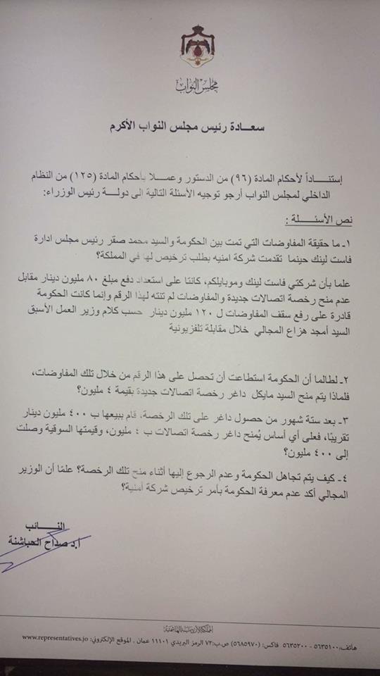وجه النائب صداح الحباشنة سؤال نيابي الى رئيس الوزراء الدكتور عمر الرزاز حول تفاصيل بيع شركة امنية للاتصالات.