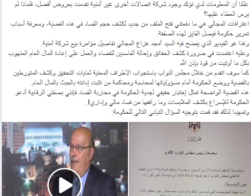 هذه القضية الواضحة تمثل إختبار حقيقي لجدية الحكومة في محاربة الفساد فإنني بصفتي الرقابية أدعو الحكومة للإسراع بكشف الملابسات وما رافقها من فساد مالي وإداري!.