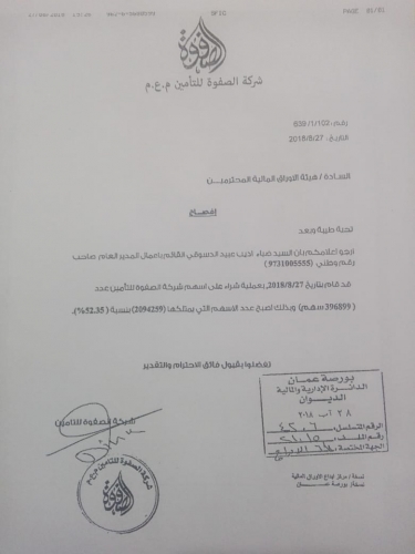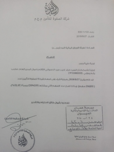 شركة الصفوة للتأمين وعبر افصاح نشرته يوم امس الثلاثاء اعلنت بأن رجل الأعمال والمستثمر الأردني الجديد ضياء اديب الدسوقي قد قام بعملية شراء على اسهم الشركة حيث قام بشراء ما مجموعه 396 الف سهم وهي الاسهم التي كانت تمتلكها مجموعة الصقر والذي لم يعد لها اي سهم في الشركة التي اصبح الدسوقي يملك ما نسبته حوالي 53% من رأس مال الشركة .