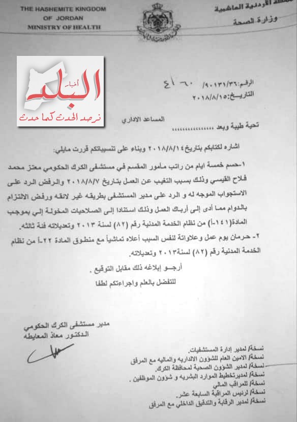 وتبين الوثيقة التي حصلت عليها " اخبار البلد " ان العقوبة جاءت استناداً الى الصلاحيات المخولة للمدير المعايطة بموجب المادة (141-أ) من نظام الخدممةة المدنية رقم (82) لسنة 2013 وتعديلاته للفئة الثالثة.