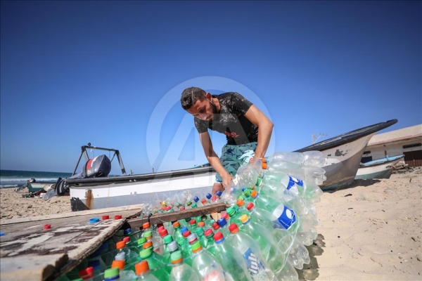 أبو زيد أمضى ساعات طويلة في تجميع هذا العدد من العبوات البلاستيكية المستعملة من على شاطئ بحر مدينة رفح، جنوبي قطاع غزة، حيث يسكن.