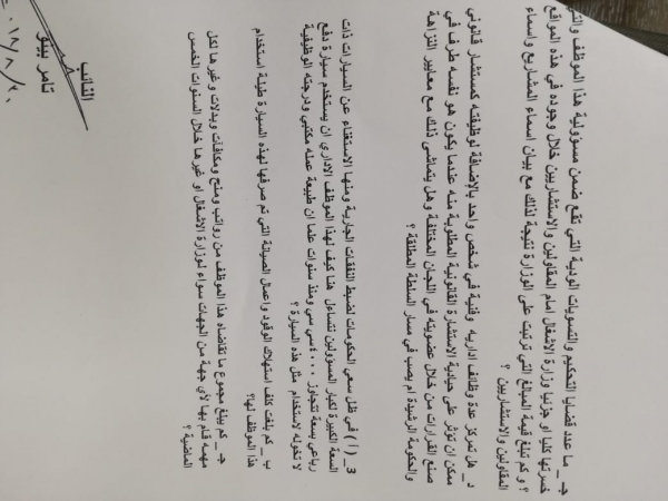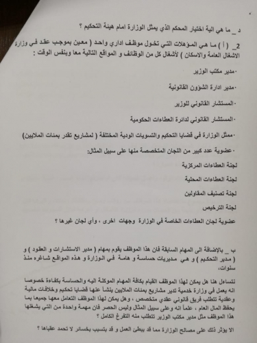 كما وطالب بمعرفة عدد قضايا التحكيم والتسويات الودية التي تقع ضمن مسؤولية هذا الموظف والتي خسرتها كليا أو جزئيا وزارة الأشغال أمام المقاولين والاستشاريين خلال وجوده في هذه المواقع، و كم تبلغ قيمة المبالغ التي ترتبت على الوزارة نتيجة لذلك مع بيان أسماء المشاريع وأسماء المقاولين والاستشاريين، وهل تمركز عدة وظائف إداريه وفنية في شخص واحد بالإضافة لوظيفته كمستشار قانوني ممكن أن تؤثر على حيادية الاستشارة القانونية المطلوبة منه عندما يكون هو نفسه طرف في صنع القرارات من خلال عضويته في اللجان المختلفة وهل يتماشى ذلك مع معايير النزاهة والحكومة أم يصب في مسار السلطة المطلقة.