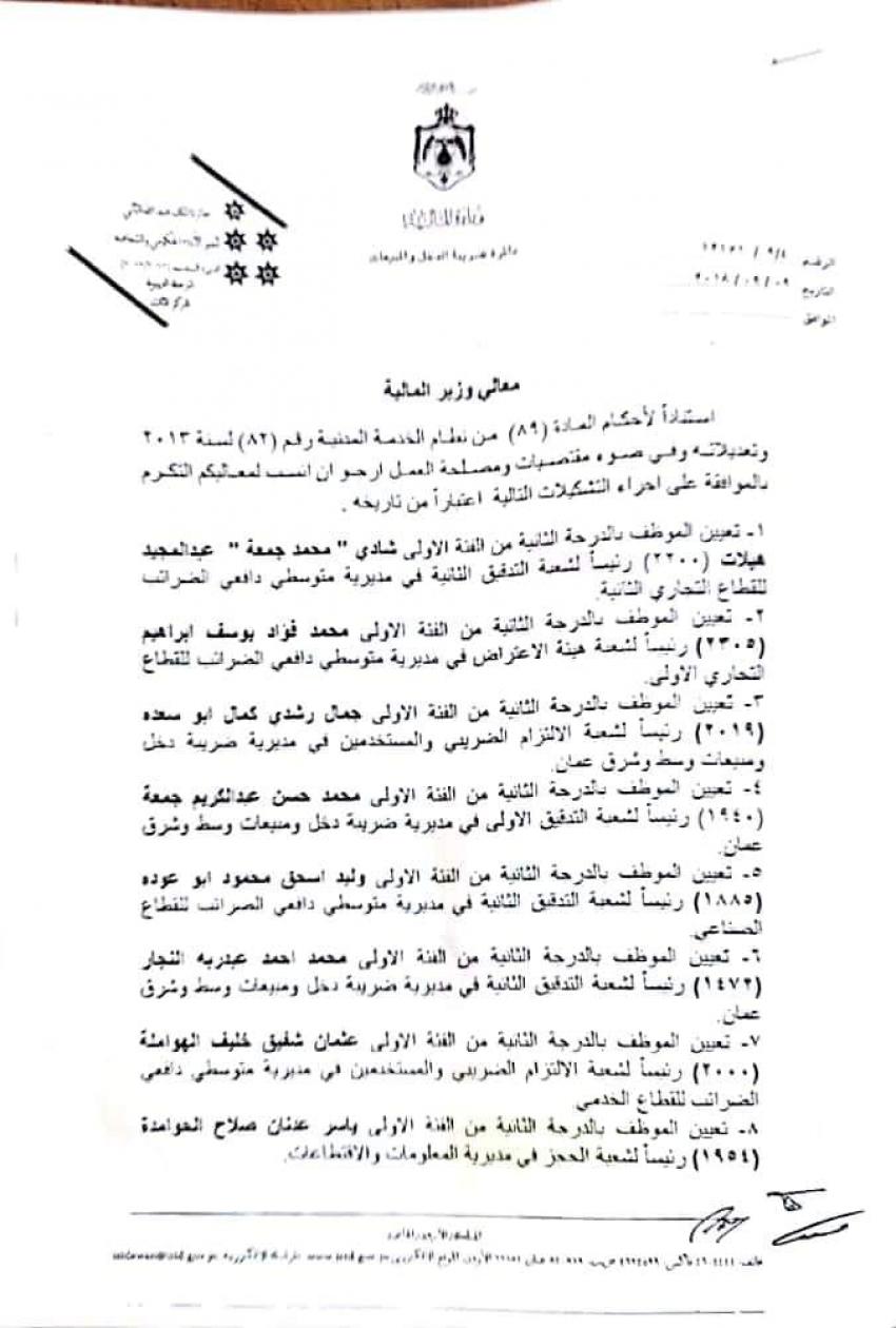 قرر مدير عام ضريبة الدخل والمبيعات حسام ابو علي اجراء تشكيلات شملت تعيين موظفين بالدرجة الثانية رؤساء لشعب في مديريات الدائرة على النحو التالي: