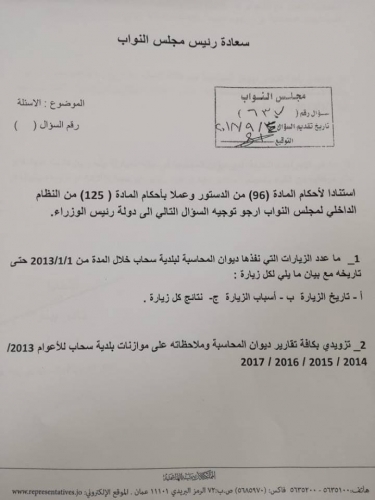 وجه عضو كتلة الاصلاح النيابية النائب تامر بينو خمسة اسئلة نيابية الى رئيس الوزراء الدكتور عمر الرزاز حول زيارات ديوان المحاسبة الى بلدية سحاب وما اسباب الزيارات ونتائجها.