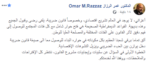 وختم الرزاز منشوره قائلاً الخطوة الأولى في السؤال عن سلبيات وإيجابيات مشروع القانون، ننتظر كل الإقتراحات والملاحظات، ووفقنا الله لخدمتكم.