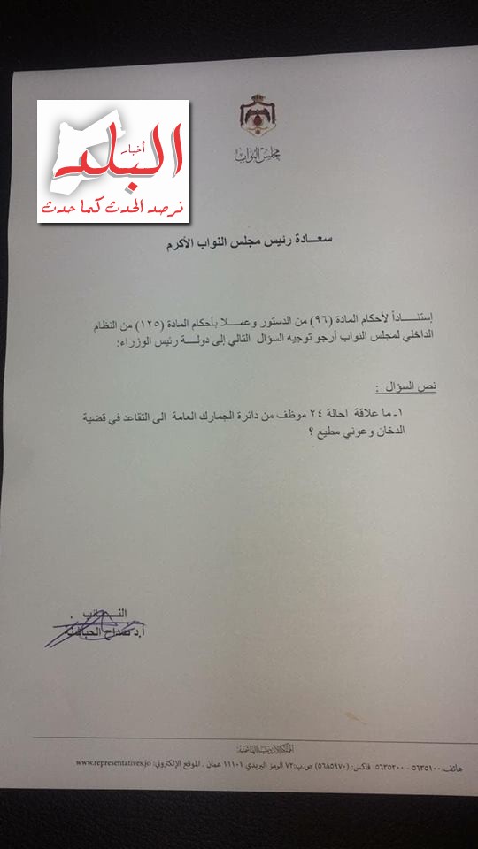 ووجه الدكتور صداح سؤال نيابي الى رئيس الوزراء الدكتور عمر الرزاز مفاده : ما علاقة احالة (24) موظف من دائرة الجمارك العامة الى التقاعد في قضية الدخان وعوني مطيع؟.