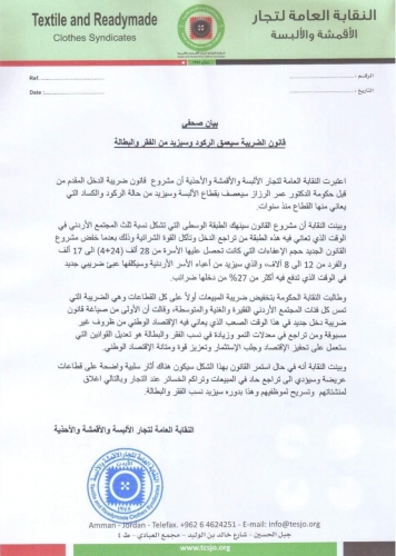 اخبار البلد - اكدت النقابة العامة لتجار الألبسة والأقمشة والأحذية أن مشروع قانون ضريبة الدخل الجديد سيعصف بقطاع الألبسة وسيزيد من حالة الركود والكساد التي يعاني منها القطاع منذ سنوات.
