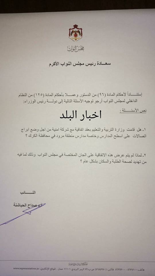 وجه النائب الدكتور صداح الحباشنة سؤال نيابي الى رئيس الوزراء الدكتور عمر الرزاز محتواه : هل قامت وزارة التربية والتعليم بعقد اتفاقية مع شركة امنية من اجل وضع ابراج اتصالات على اسطح المدارس وخاصة مدارس منطقة مرود في محافظة الكرك؟