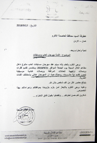 وبموجب الكتاب الرسمي الذي تم تداوله فقد تبيّن ان ادارة المطعم وجهت كتابا رسميا لوزارة الداخلية لتنظيم مهرجان العاب ومسابقات.