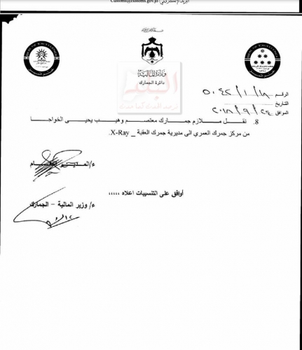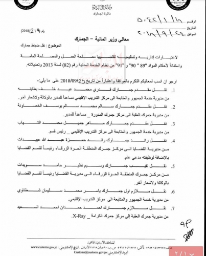 وافق وزير المالية الدكتور عزز الدين كناكرية اليوم الاثنين على تنسيب مدير عام دائرة الجمارك اللواء الدكتور عبد المجيد الرحامنة باجراء عدد من التنقلات التي طالت عدد من الضباط .