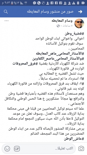 فيما اكد الناشط الأجتماعي وسام المعايطه من خلال صفحته الشخصيه أن هناك مجموعه من المواطنين منهم محامين متبرعين عازمين على رفع قضيه ضد الشركه لأسترداد المبالغ التي جبتها من المواطنين طيلة مدة فرض هذا البند