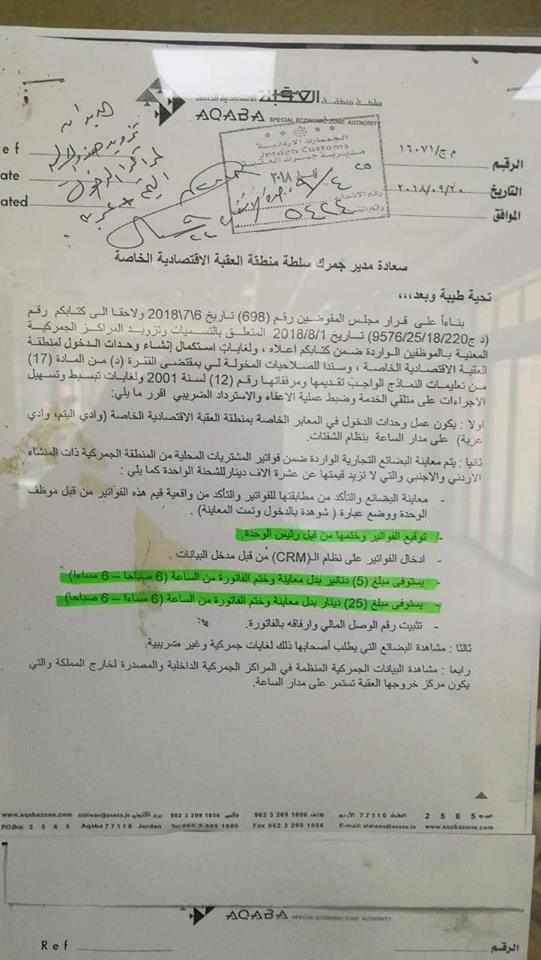 5. يستوفى مبلغ (25) دينار بدل معاينة وختم الفاتورة من الساعة (6 مساءاً - 6 صباحاً).