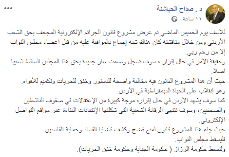 وقال النائب الحباشنة في منشور رصدته "اخبار البلد"، ان حقيقة الامر في حال تم اقرار القانون سوف تسجل وصمة عار جديدة بحق هذا المجلس الساقط شعبياً اصلاً ،حيث أن مشروع القانون فيه مخالفة واضحة للدستور وخنق للحريات وتكميم للأفواه وهو إنقلاب على الحياة الديمقراطية في الأردن.