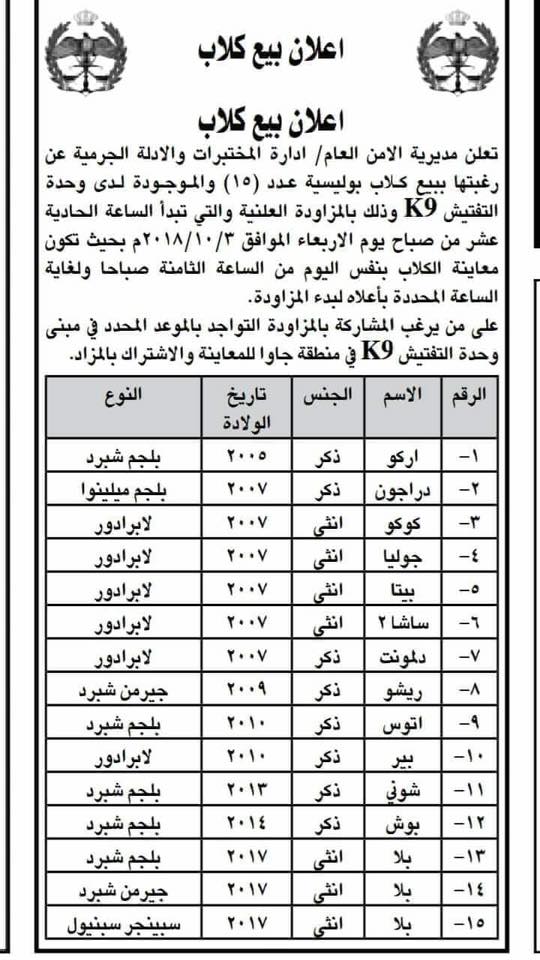 أخبار البلد – أعلنت مدیریة الأمن العام، عن مزاد علني لبیع كلاب بولیسیة تمتلكھا.