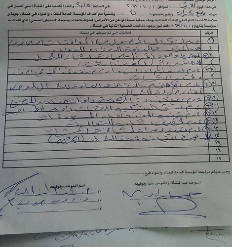 هذا وكانت مؤسسة الغذاء قد قامت بأجراءات التحفظ على جميع المواد لغايات الاتلاف واغلاق المصنع اغلاقاً تحفظيا وتنظيم ضبط بالسلبيات الحرجة لغايات تحويل اصحاب العلاقة للقضاء بموجب نصوص قانون الغذاء والدواء الساري المفعول.