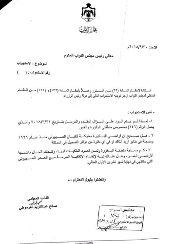 حول النائب صالح العرموطي سؤاله النيابي بخصوص موضوع تاجير اراضي منطقتي الباقورة والغمر الى استجواب.