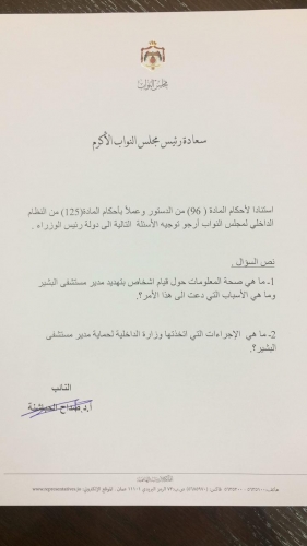 وبين الحباشنة انه ونتيجة لذلك قام بتوجيه سؤال نيابي لرئيس الوزراء الدكتور عمر الرزاز حول مدى صحة هذه المعلومات؟ وما هي الإجراءات التي تم اتباعها لحماية مدير المستشفى.